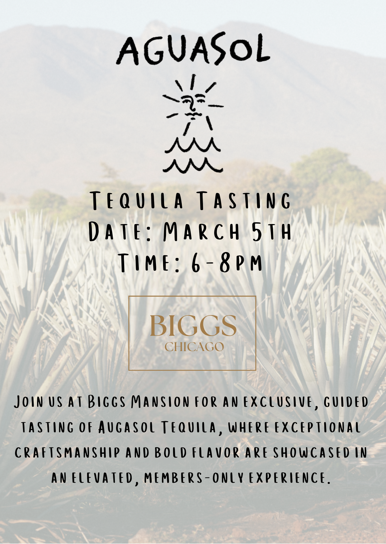 Join us at Biggs Mansion for an exclusive tequila tasting featuring Augasol Tequila, where craftsmanship, heritage, and bold flavor come together in an elevated, members-only experience. Enjoy a guided tasting that highlights the artistry behind each pour, paired with the refined ambiance and signature hospitality of Biggs Mansion.